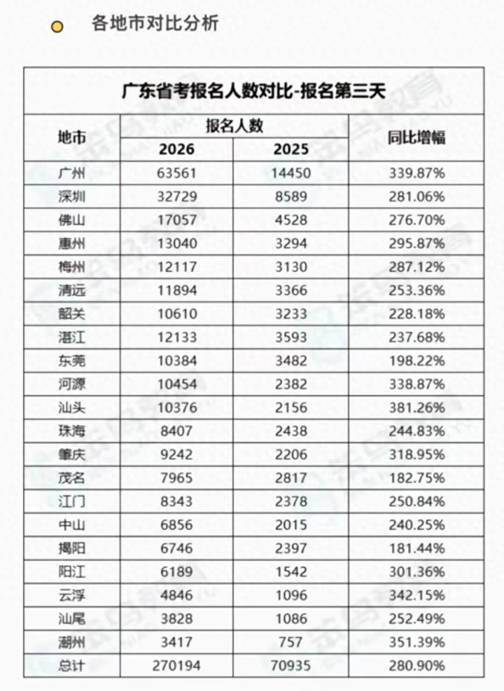 近年来,广东省公务员考试的报名人数如同坐上了火箭,一路飙升。特别是2026年,各地市报名人数均呈现大幅增长态势,总体增幅超过181%,这数字简直让人瞠目结舌。汕头市更是其中的佼佼者,报名人数从去年的2156人猛增至今年的10376人,增幅之大,令人咋舌。这背后,除了广东公务员岗位的吸引力,恐怕还与广东在岗位报考中未设置户籍限制这一明智之举密不可分。广东,正以开放的姿态,向全国人才敞开怀抱。